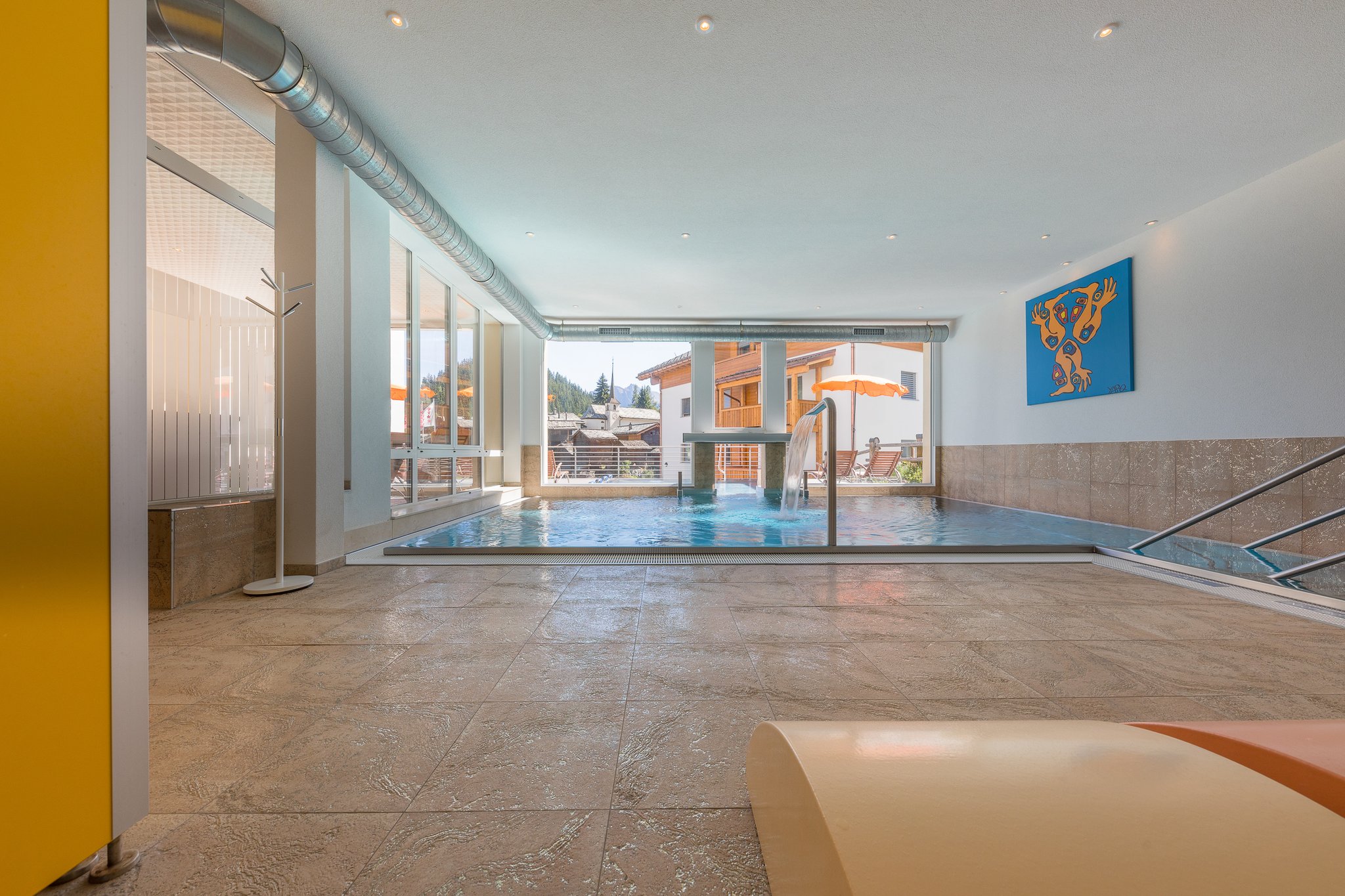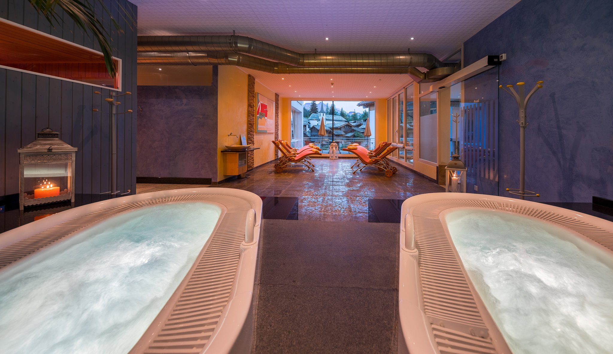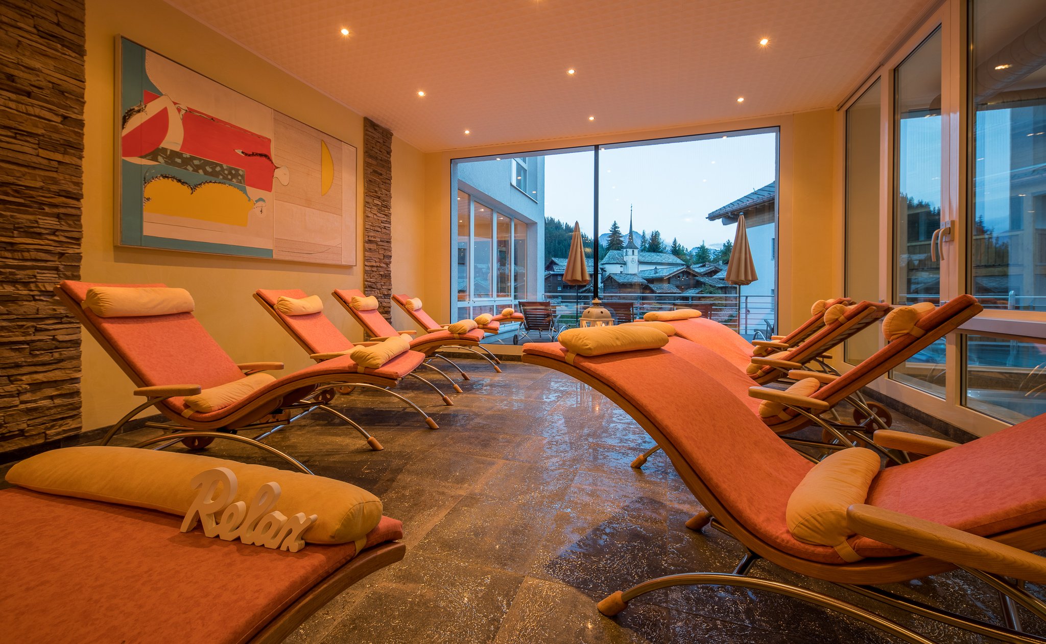 Our wellness area (approx. 150m2), built in 2006, includes a steam bath, a bio sauna, a Physiotherm infrared cabin, experience showers and a lounge area with a wonderful view of the old Blatten.