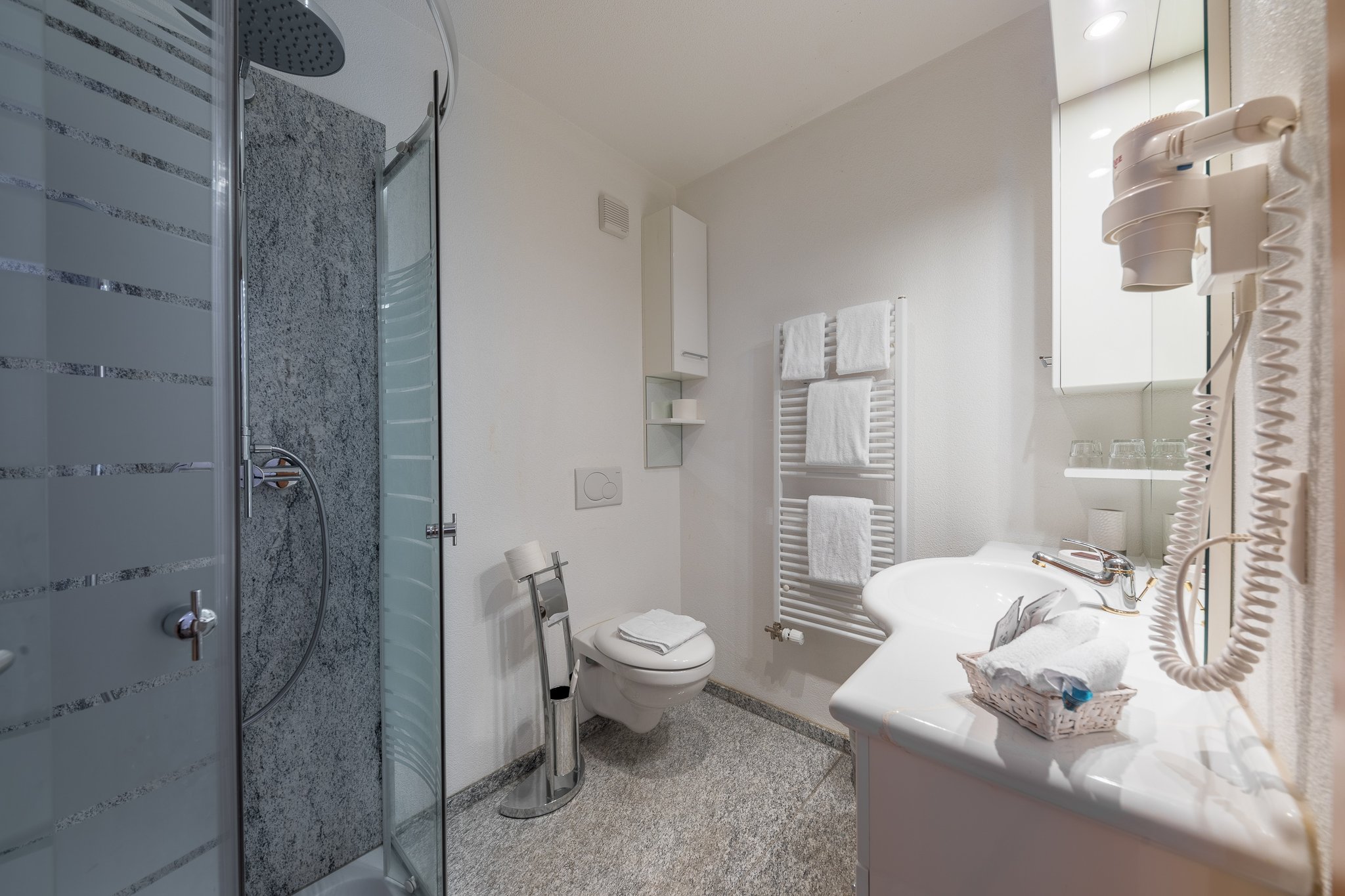 Die Böden sind aus Laminat, die Böden im WC/Dusche sind aus Granitplatten. Alle Zimmer haben ein eigenes Bad mit WC und Dusche, SAT-Flat TV, Safe, und Haartrockner.